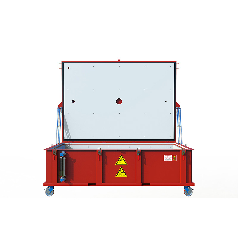 Die Box besteht aus einer 5 mm starken Stahlblechhülle mit feuer- und korrosionsbeständiger Innenauskleidung. Explosionsöffnungen und Druckentlastungsventile an der Oberseite sorgen dafür, dass mögliche Batterieexplosionen kontrolliert nach außen abgeleitet werden – die Umgebung bleibt geschützt. -
