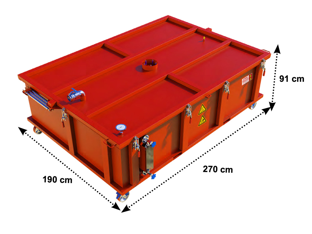 Diese speziell entwickelte Sicherheitsbox ermöglicht es Einsatzkräften, Fahrzeugbatterien aus verunfallten oder brennenden Elektrofahrzeugen sicher aufzunehmen, zu kühlen, zwischenzulagern und zu transportieren.